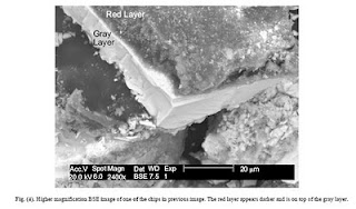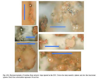 We wszystkich próbkach pyłu powstałego podczas destrukcji Światowego Centum Handlu [WTC], jakie badaliśmy, stwierdziliśmy wyróżniające się czerwono-szare cząstki. Cząstki te wykazują znaczne podobieństwo we wszystkich czterech próbkach. Jedna próbka została pobrana przez mieszkańca Manhattanu w około dziesięć minut po upadku drugiej wieży WTC, dwie z nich dnia następnego, a czwarta około tygodnia później. Właściwości tych cząstek były analizowane za pomocą mikroskopii optycznej, mikroskopii metodą skaningu elektronowego (SEM), spektroskopii rozpraszania energii promieniowania X (XEDS), oraz kalorymetrii opartej na metodzie skaningu różnicowego (DSC). Czerwony materiał zawiera głównie ziarna tlenku żelaza o wielkości ok. 100 nm, podczas gdy płytkopodobne struktury zawierają aluminium. Oddzielenie składników przy pomocy ketonu metylowo-etylowego wykazało obecność elementarnego aluminium. Tlenek żelaza i aluminium są w czerwonym materiale ściśle ze sobą zmieszane. Podczas zapłonu w aparacie DSC cząstki te wykazywały dużą, lecz wąską egzotermię, występującą przy temperaturze 430 stopni Celsjusza, znacznie poniżej temperatury zapłonu termitu konwencjonalnego. W resztkach powstałych w wyniku zapłonu owych szczególnych czerwonych cząstek często obserwuje się liczne kuliste cząstki, bogate w żelazo. Stwierdzono, że czerwona warstwa owych cząstek jest to wysokoenergetyczny materiał termitowy.